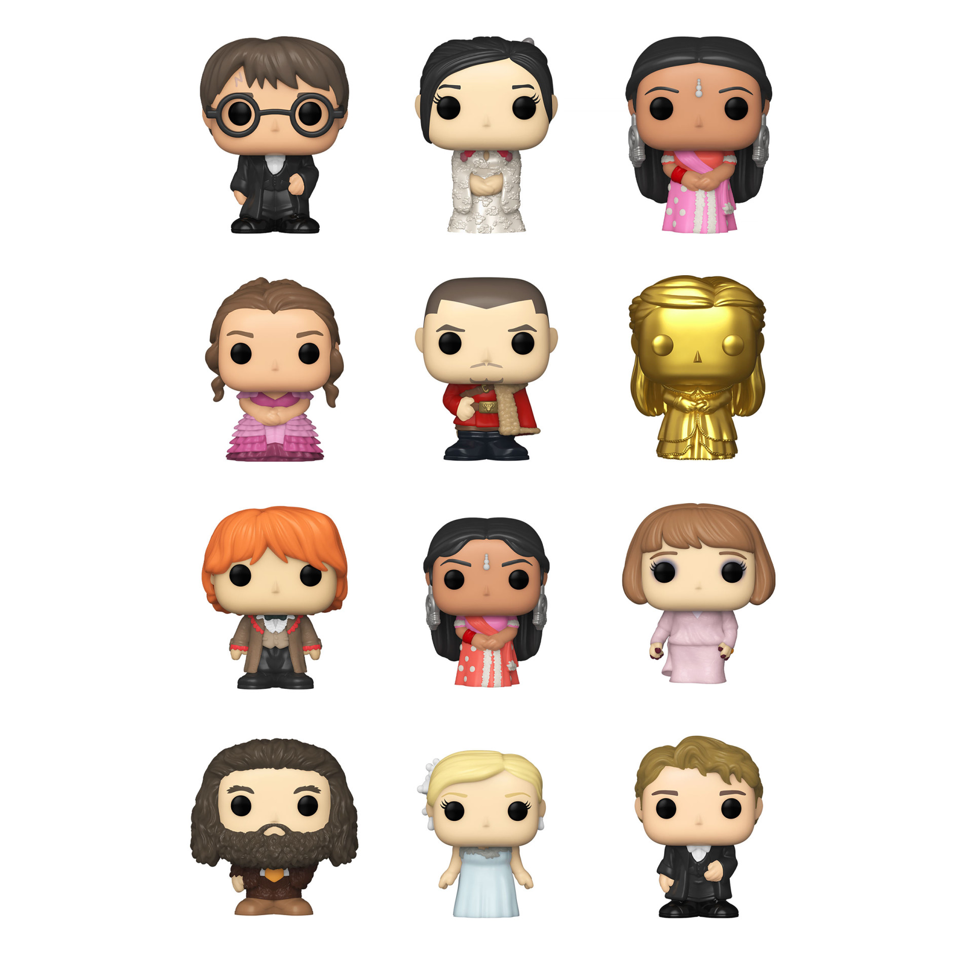 Diminuendo ! Vos Harry Potter™ Pops ! préférés ont été rétrécis en Bitty Pops ! Élargissez votre collection Wizarding World™ avec cet assortiment de figurines Bitty Pop ! à l'effigie de vos personnages Harry Potter les plus appréciés ! Ce pack de 4 comprend les figurines Bitty Pop ! Hermione Granger™ (Yule Ball), Bitty Pop ! Viktor Krum™ (Yule Ball), Bitty Pop ! Ginny Weasley™ (Yule Ball), et une figurine Bitty Pop ! mystère. Les Bitty Pops ! mystères possibles sont Hyper Rare (1/6) Cedric Diggory™ (Triwizard Tournament™), Hyper Rare (1/6) Rita Skeeter™, Rare (1/3) Harry Potter™ (Triwizard Tournament), et Rare (1/3) Fleur Delacour™ (Triwizard Tournament).